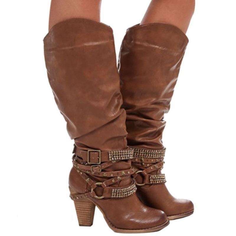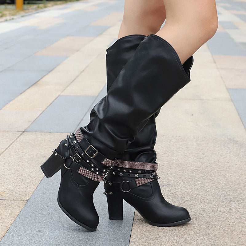 Women's Knee high slouch boots rhineston buckle strap wide calf boots