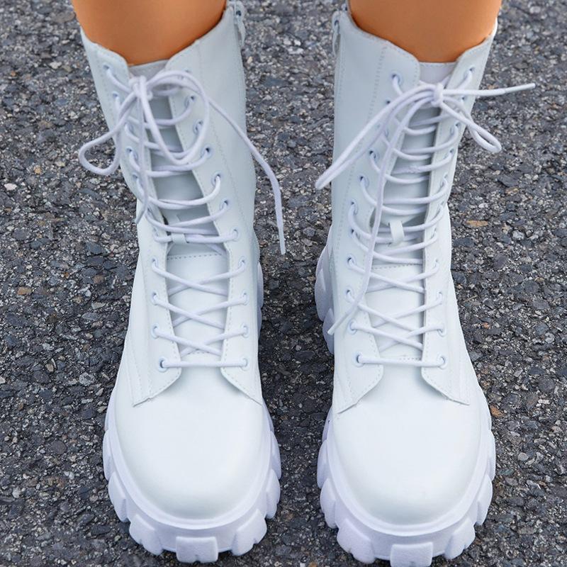 Women's chunky platform lace-up boots round toe mid calf combat boots