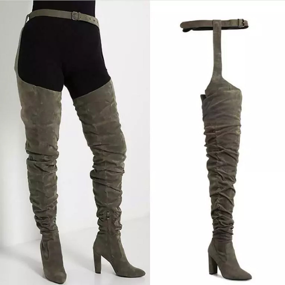 Women faux suede thigh high waist belt chunky high heel slouch boots | Over the knee waist belted boots