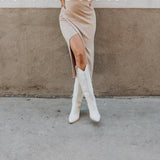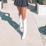 Retro embroidery stacked heel cowboy boots under knee white western boots