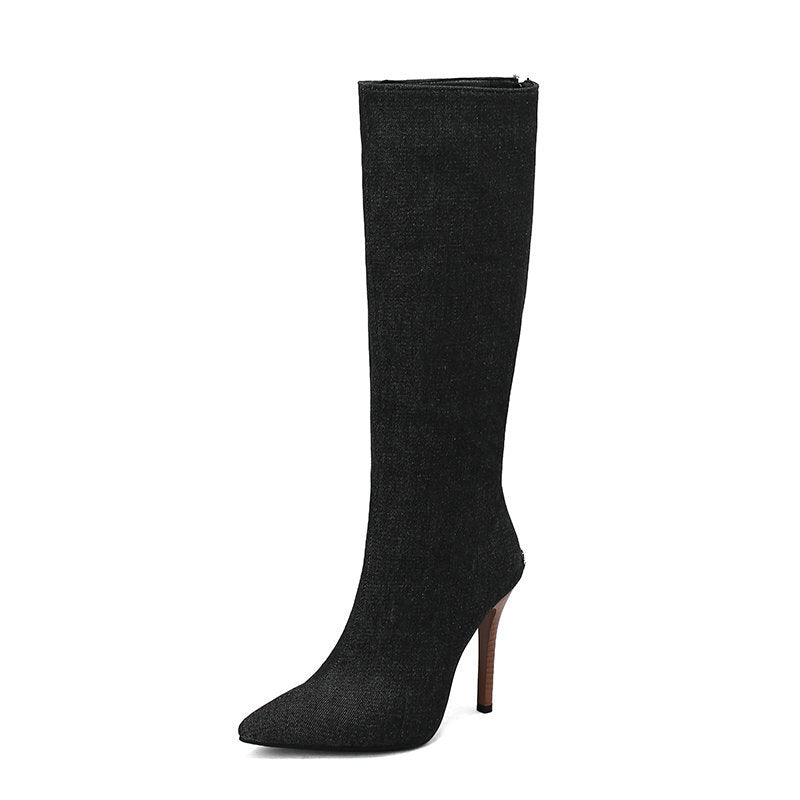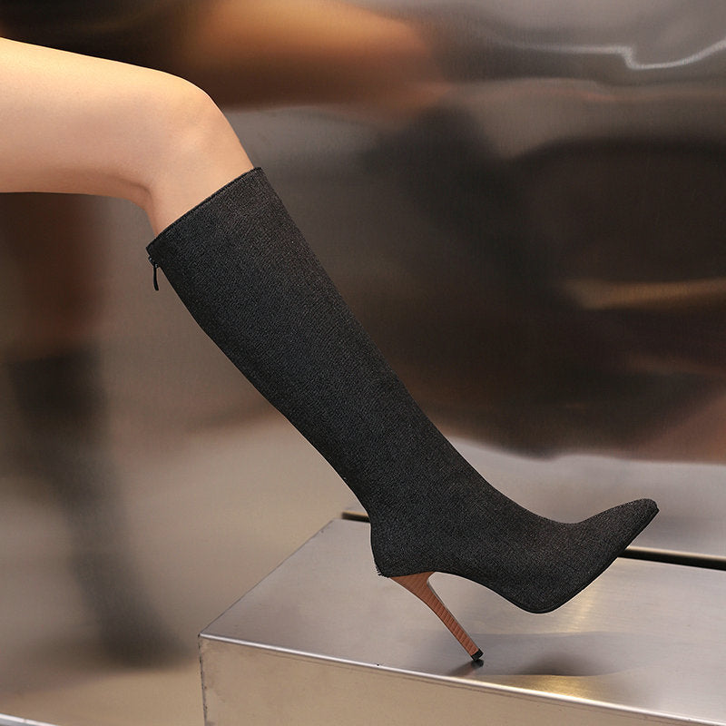 Black Stiletto heels pointed toe knee high boots with back zipper