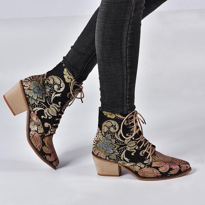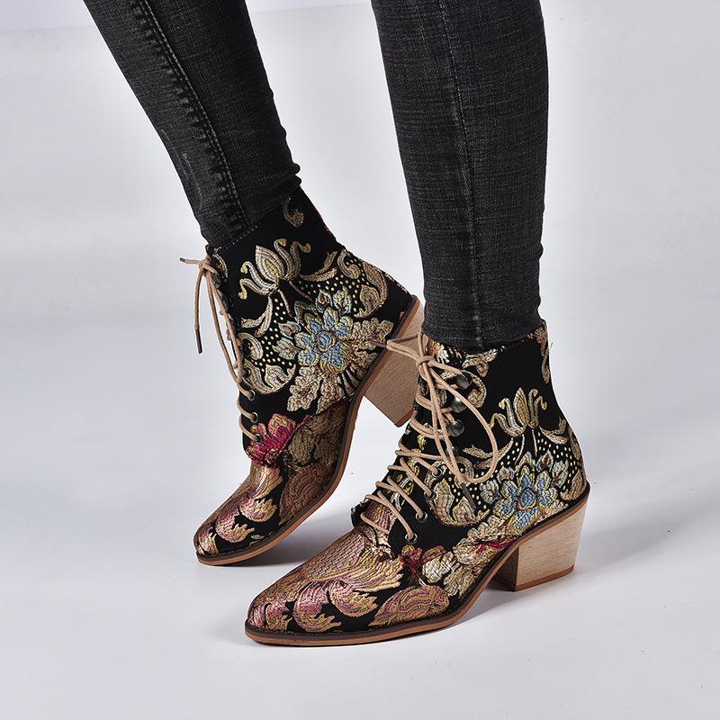 Women embroidered boots | Vintage chunky lace-up boots | Block heel boots ankle high