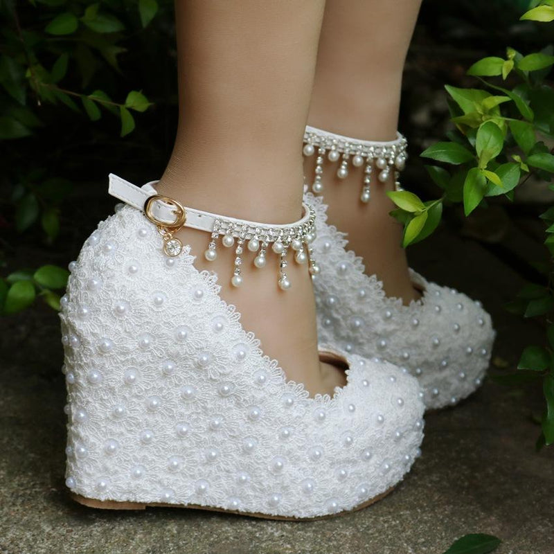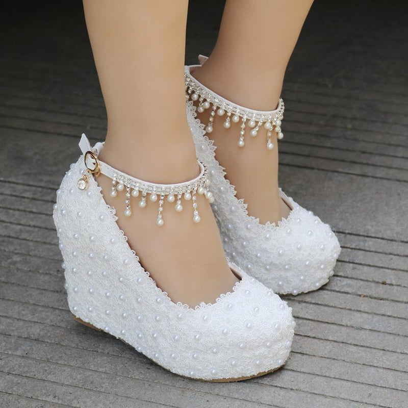 Women's lace pearls pumps closed toe platform wedge bridal shoes, 4.3"